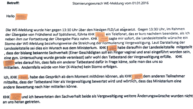 Es ist glaubhaft belegt, dass das Innenministerium versucht hat, die Nennung einer Vergewaltigung (manuelle Penetration; vaginal & anal) zu verhindern. Auch die entsprechende Email sollte vertuscht werden.